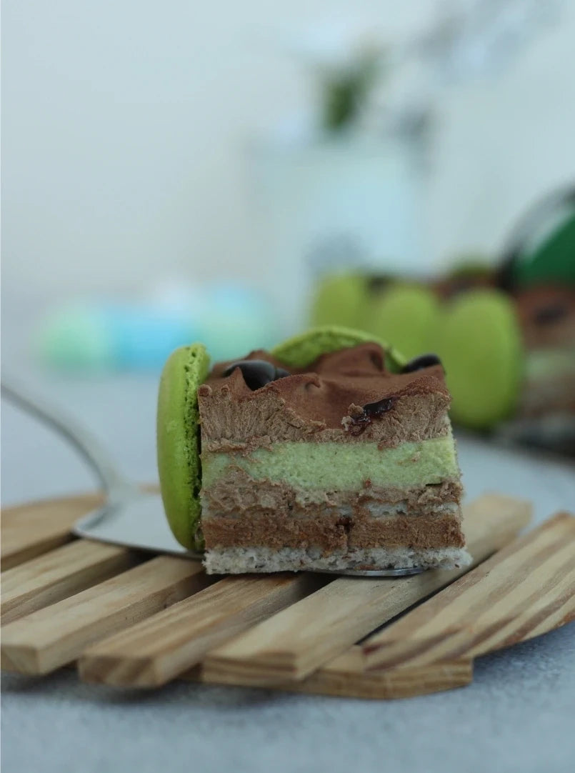 Finest chocolate mousse & pistachio bavaroise with hazelnut biscuit topped with hazelnut macaroon.