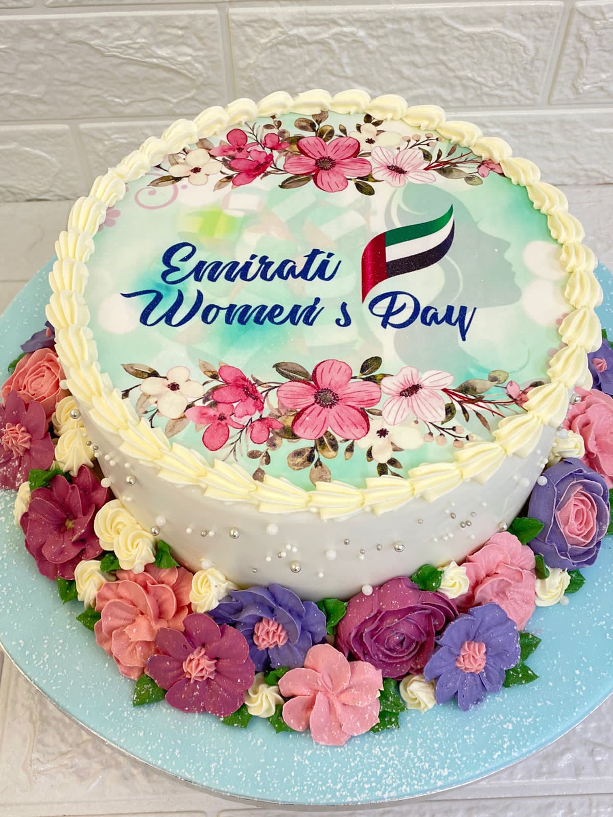 Celebrate Emirati Women’s Day with this beautifully crafted cake, adorned with delicate floral designs, elegant pastel buttercream flowers, and a touch of elegance that makes every moment memorable.