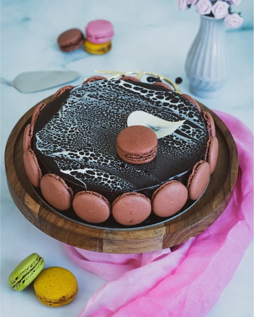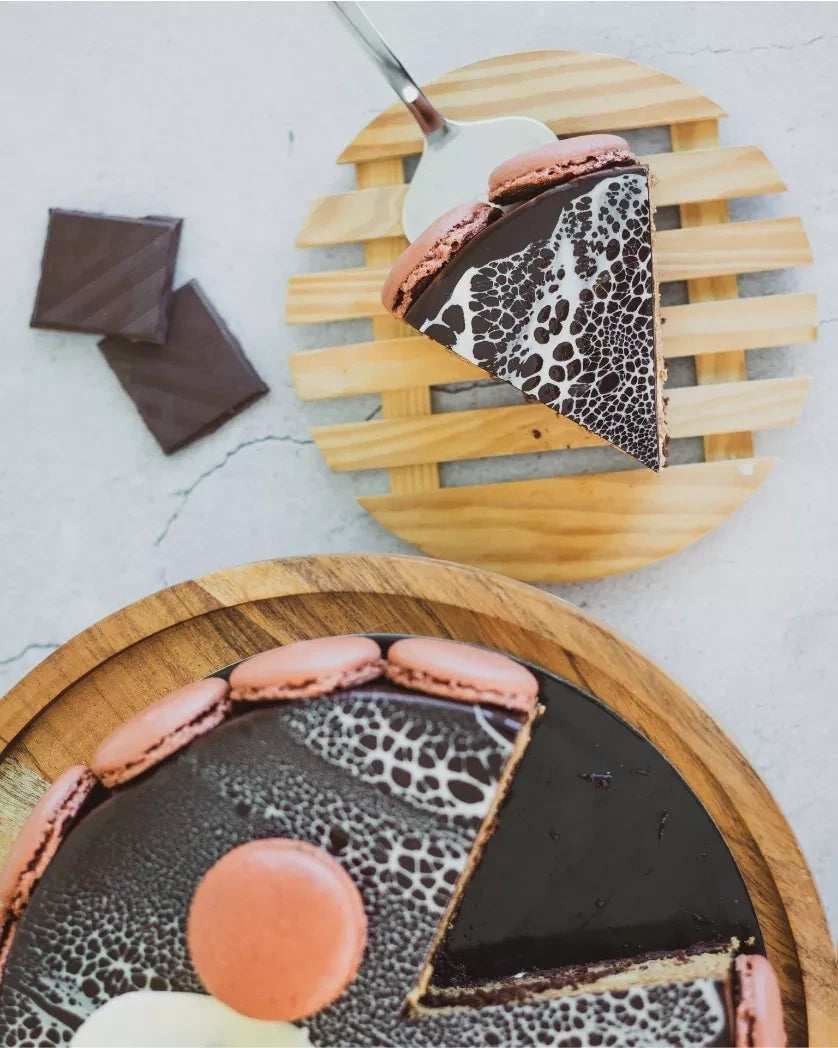 Soft chocolate mousse bavaroise with creme brulee. Rich & decadent with velvety smooth texture mirrored with dark chocolate glaze.